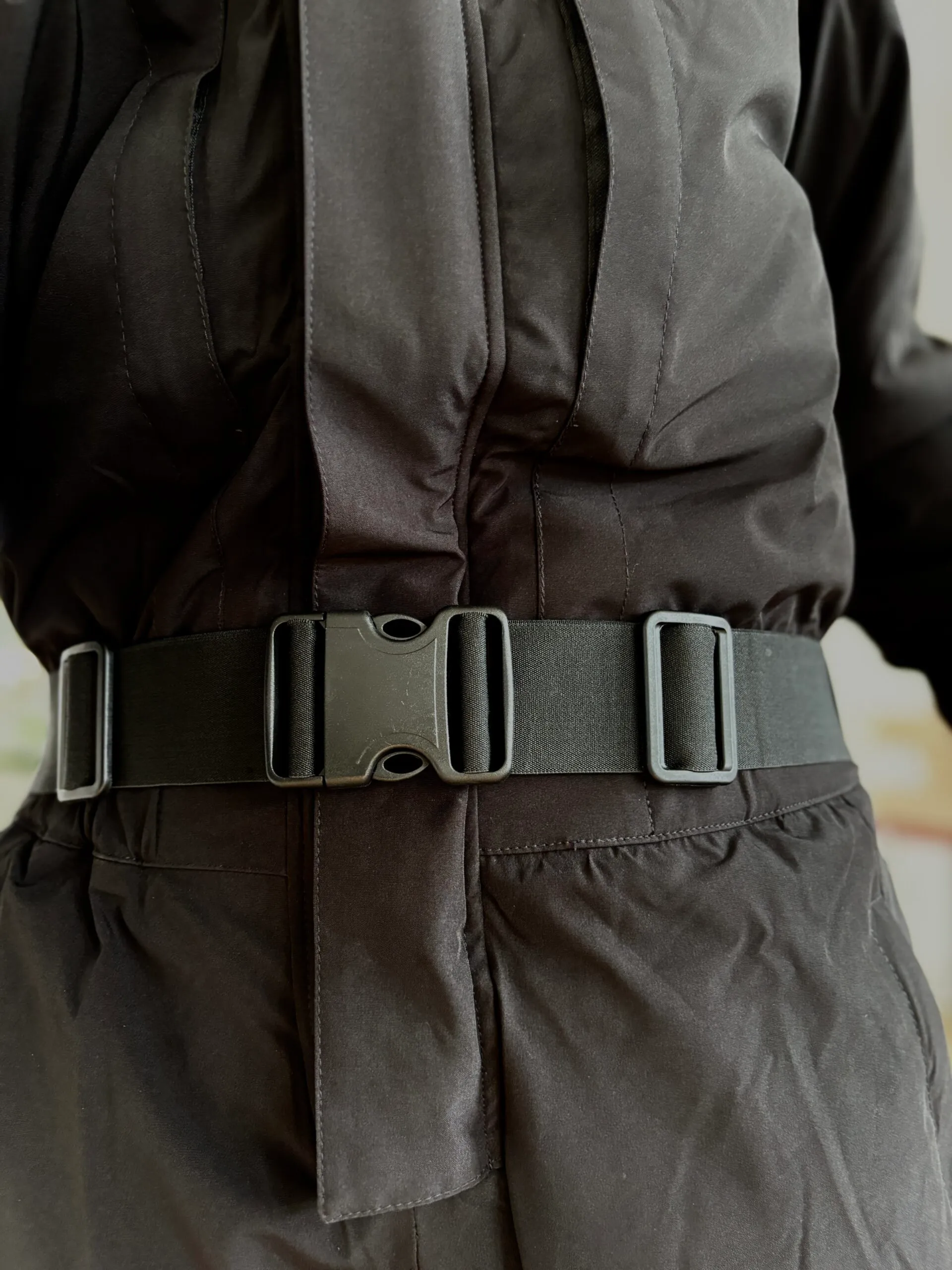 - Riem onder de voet met clips — houdt het pak netjes op zijn plek in laarzen